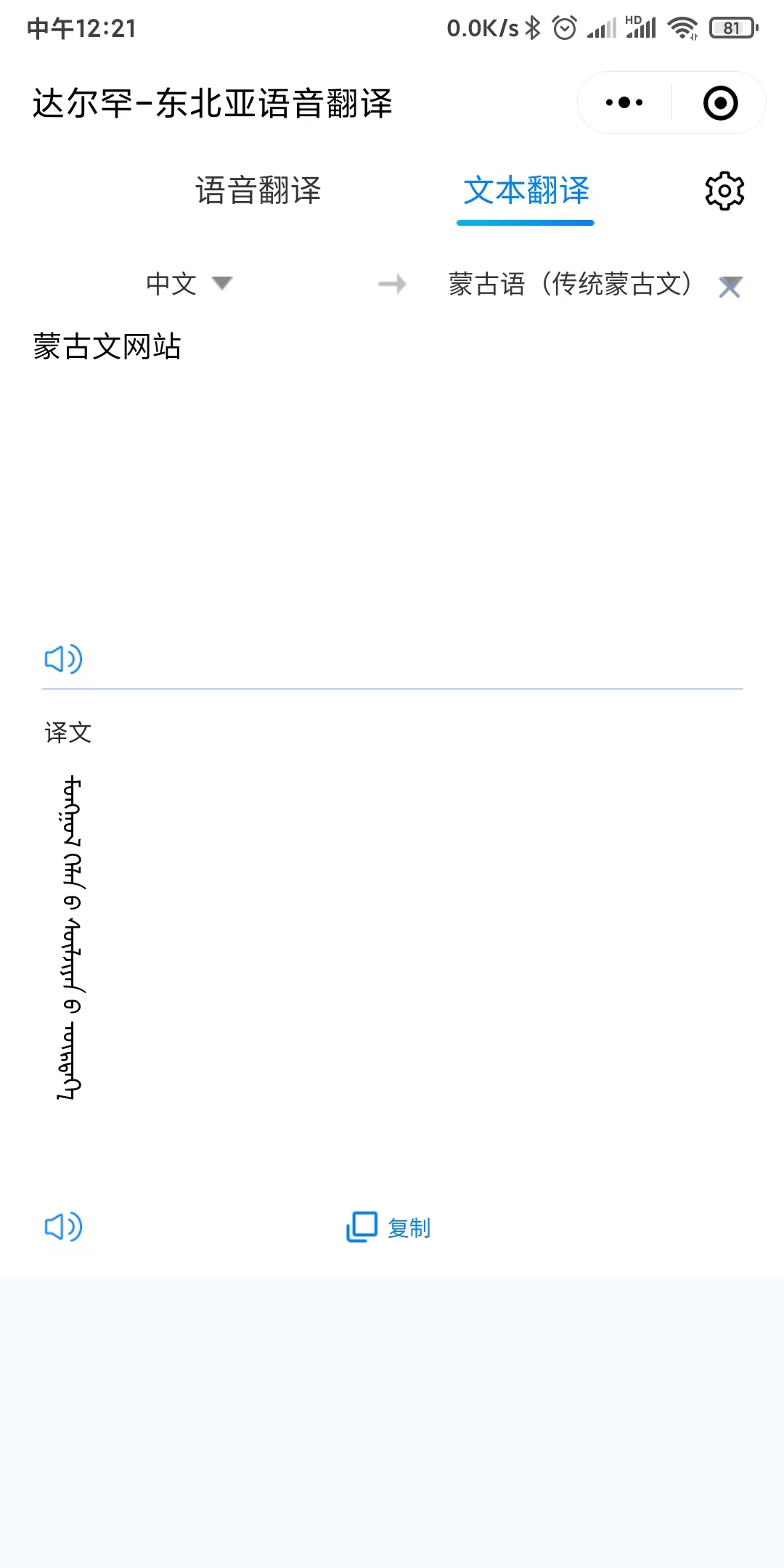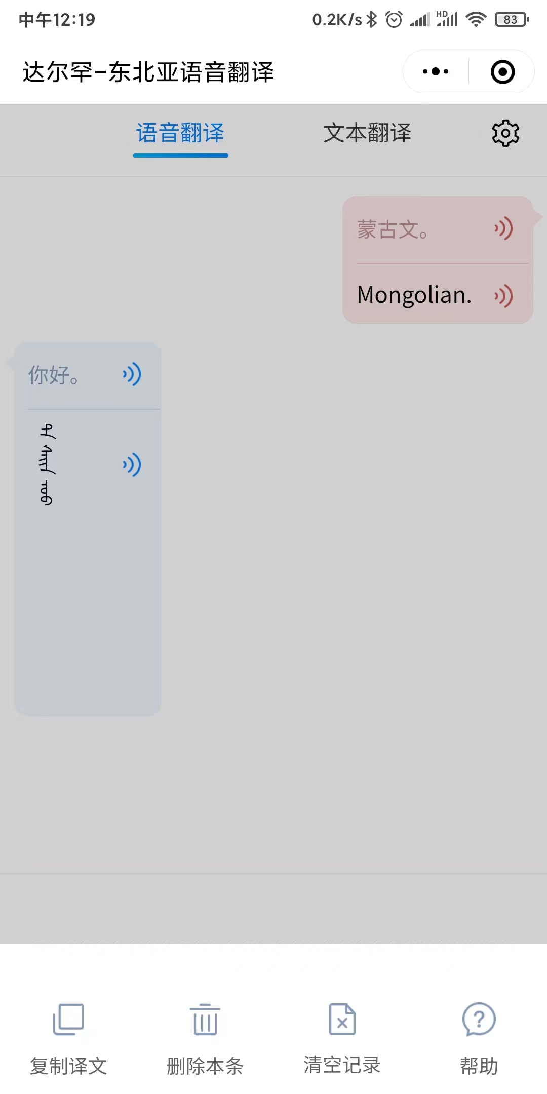 东北亚语音翻译微信小程序,支持中文普通话、英语、俄语、锐、汉韩语、蒙古语(传统蒙古文)、蒙古语(西里尔蒙古文)等7种语言互译。